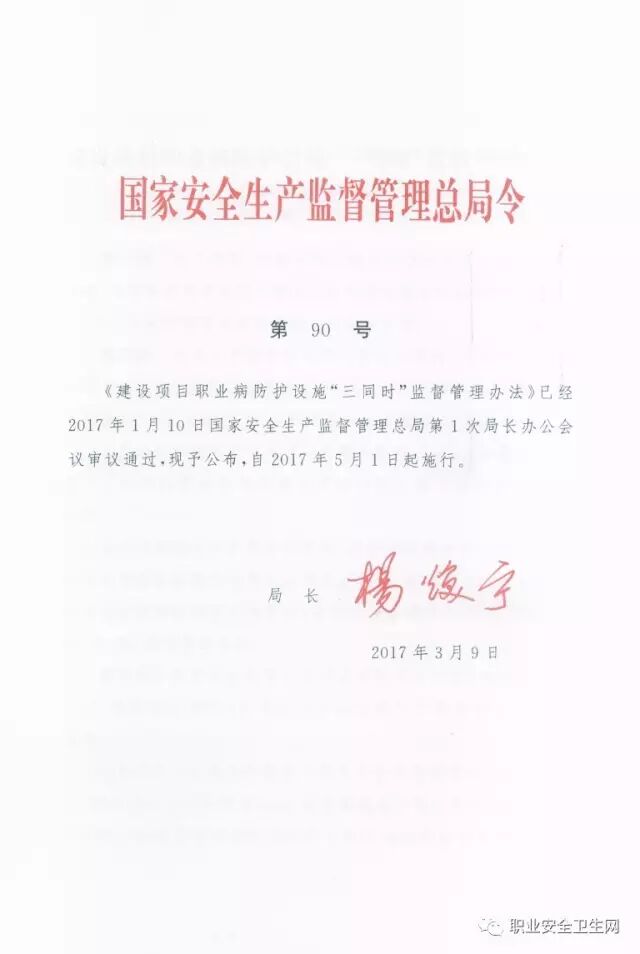 第四十六條本辦法自2017年5月1日起施行。國家安全生產(chǎn)監(jiān)督管理總局2012年4月27日公布的《建設(shè)項目職業(yè)衛(wèi)生“三同時”監(jiān)督管理暫行辦法》同時廢止。